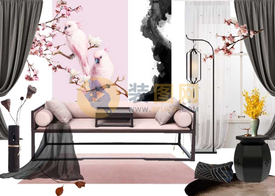 成就您的精美家居:粉色系桃花中式软装PSD/PNG素材